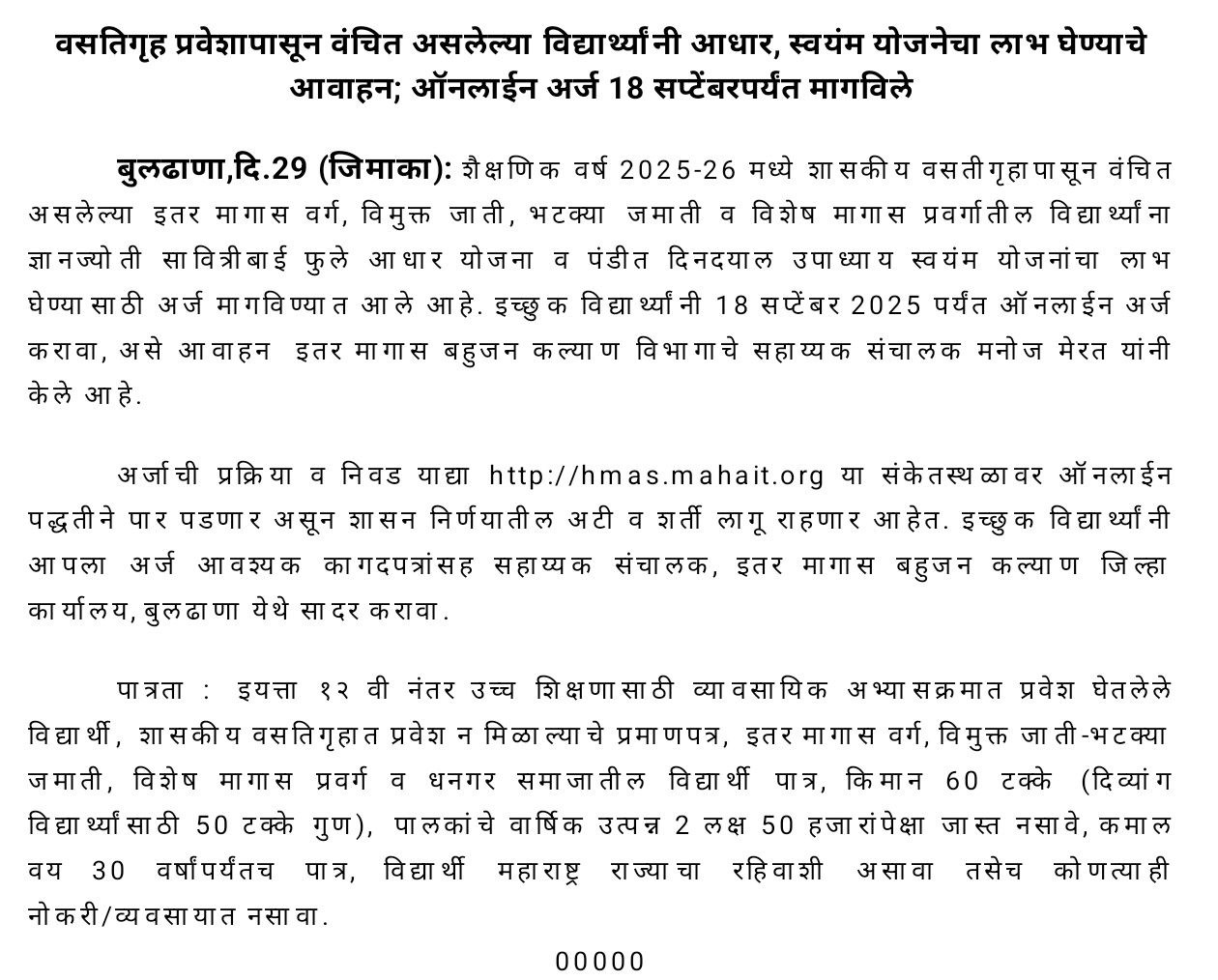 वसतिगृह प्रवेशापासून वंचित असलेल्या विद्यार्थ्यांनी आधार, स्वयंम योजनेचा लाभ घेण्याचे आवाहन; ऑनलाईन अर्ज 18 सप्टेंबरपर्यंत मागविले..